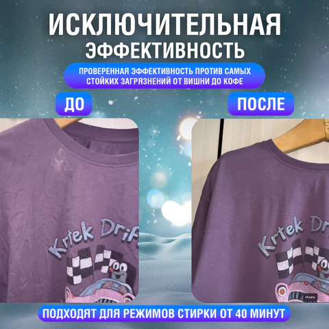 Капсулы подходят для стирки цветных изделий из хлопчатобумажных, льняных, синтетических тканей и тканей из смешанных волокон (кроме шелка и шерсти).