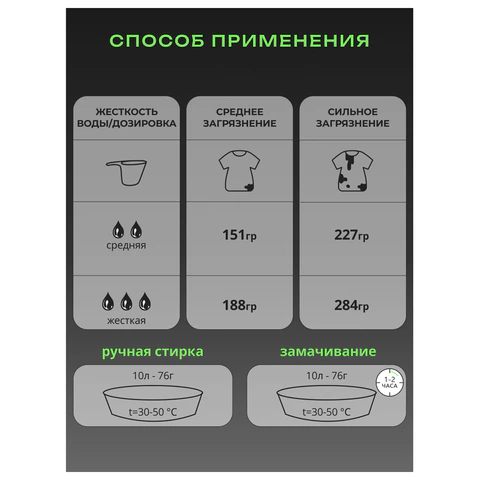 Полностью растворяется в моющем растворе и выполаскивается из ткани. С легкостью удаляет загрязнения и трудновыводимые пятна благодаря комплексу биодобавок и двойной системе ПАВ. Рекомендован для замачивания и стирки изделий из ярких цветных тканей при пониженных температурах в автоматическом и ручном режиме.