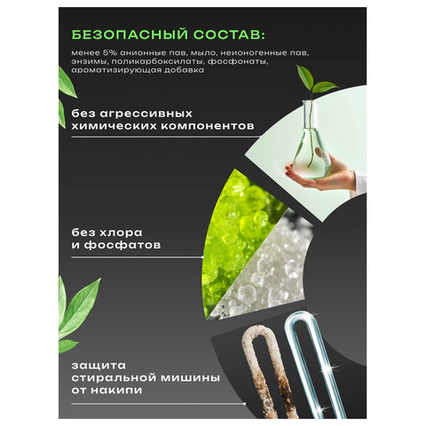 Состав: менее 5%: анионные ПАВ, мыло (соли жирных кислот), неионогенные ПАВ, поликарбоксилаты, ароматизирующая добавка.
