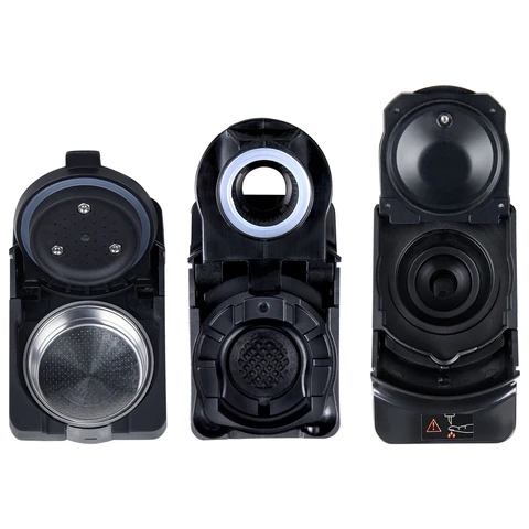 Устройство имеет несколько съемных адаптеров для капсул Nespresso и Dolce Gustо, а также для молотого кофе. На верхней части корпуса расположена панель управления, благодаря которой вы можете включить кофемашину и выбрать нужный напиток.
