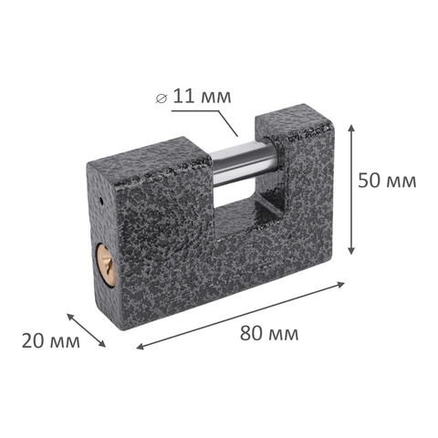 Размеры замка: ширина – 80 мм, высота корпуса – 50 мм, толщина – 20 мм.