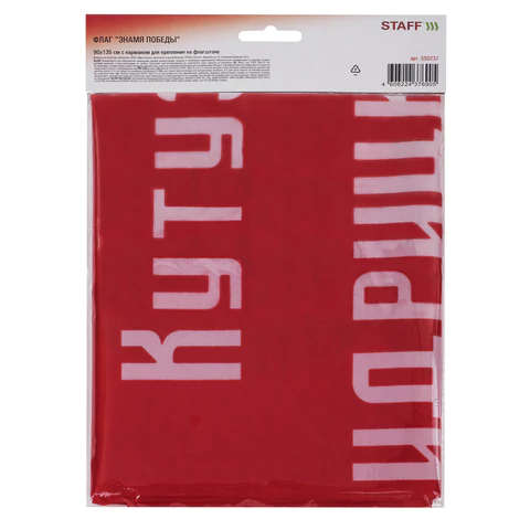 Флаг "Знамя Победы" представляет собой прямоугольное красное полотно, на лицевой стороне которого вверху изображены серебряные пятиконечная звезда, серп и молот, а на остальной части полотнища – надпись белыми буквами в четыре строки: «150 стр. ордена Кутузова II ст. идрицк. див. 79 С. К. 3 У. А. 1 Б. Ф.». Яркое изображение с двух сторон флага. Полотно флага оснащено карманом под флагшток, есть закрепляющие завязки снизу. Максимальный диаметр флагштока - 3 см. Флаг выполнен из плотного полиэстера. Размер - 90х135 см, плотность материала - 68 Ден. Флагшток не входит в комплект.