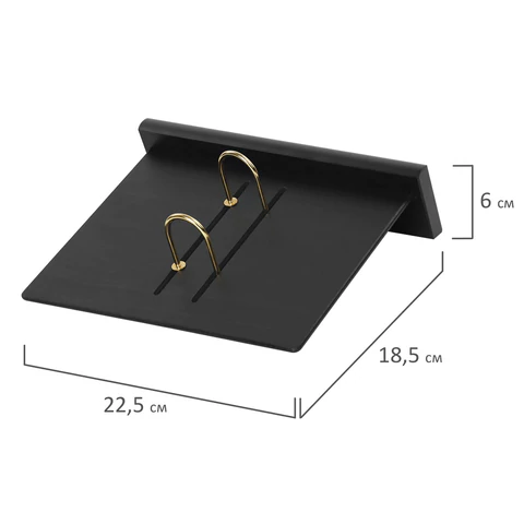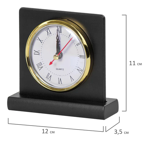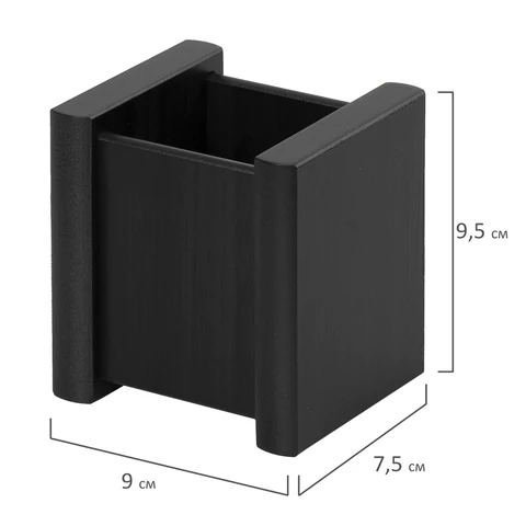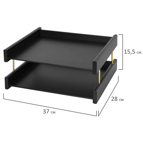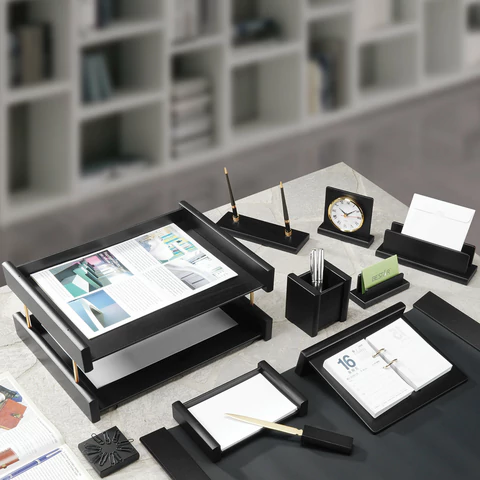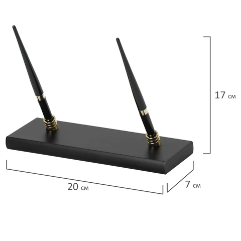 Набор состоит из 11 предметов: двойной лоток для бумаг, коврик для письма (размер - 66х43 см), подставка для ручек (2 шариковые ручки в комплекте), стакан-подставка для письменных принадлежностей, подставка для бумажного блока, подставка для визиток, нож для вскрытия конвертов, подставка для писем, скрепочница магнитная, подставка для перекидного календаря, часы. Все предметы изготовлены из дерева черного цвета с золотистой фурнитурой. Набор упакован в фирменную подарочную коробку.