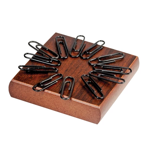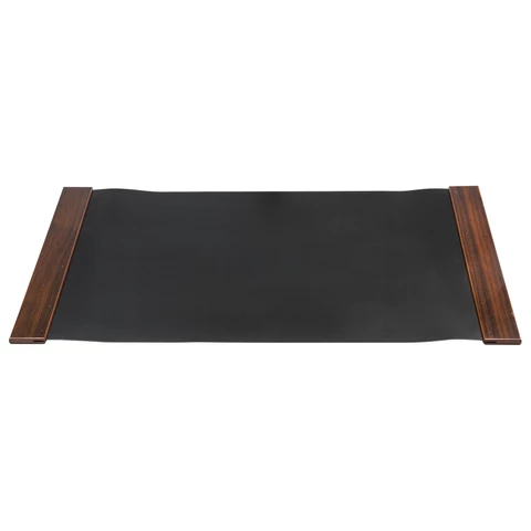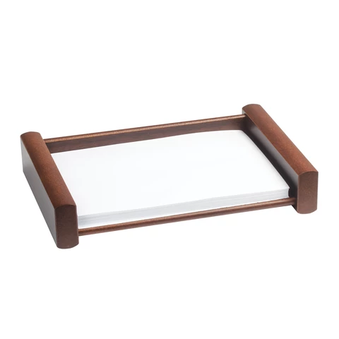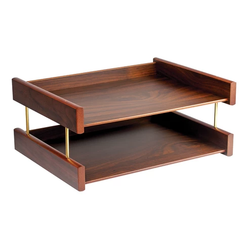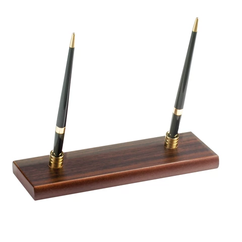 Набор состоит из 11 предметов: двойной лоток для бумаг, коврик для письма (размер - 66х43 см), подставка для ручек (2 шариковые ручки в комплекте), стакан-подставка для письменных принадлежностей, подставка для бумажного блока, подставка для визиток, нож для вскрытия конвертов, подставка для писем, скрепочница магнитная, подставка для перекидного календаря, часы. Все предметы изготовлены из дерева цвета "орех" с золотистой фурнитурой. Набор упакован в фирменную подарочную коробку.