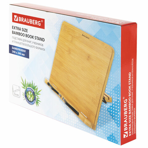 Подставка BRAUBERG выполнена из экологичного материала - бамбука. Она способна удержать даже увесистые книги или гаджеты. Регулируемый наклон подставки позволяет комфортно разместить книгу, журнал или планшет на рабочем месте, обеспечивая удобство при чтении и работе с текстом, а также при просмотре видео. Держатели страниц, фиксирующие книгу снизу на выбранной странице, также оснащены насадками, которые защищают поверхность от царапин. Имеет увеличенный размер - 34х24 см.