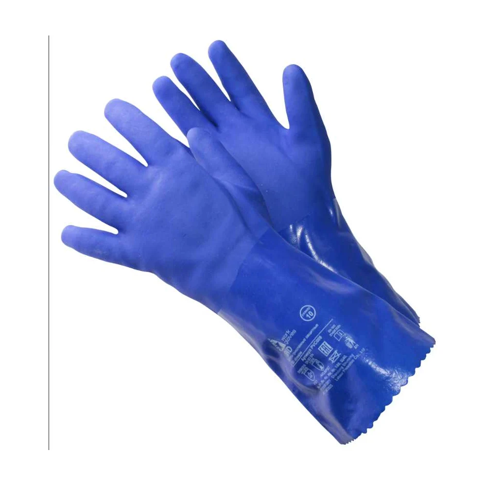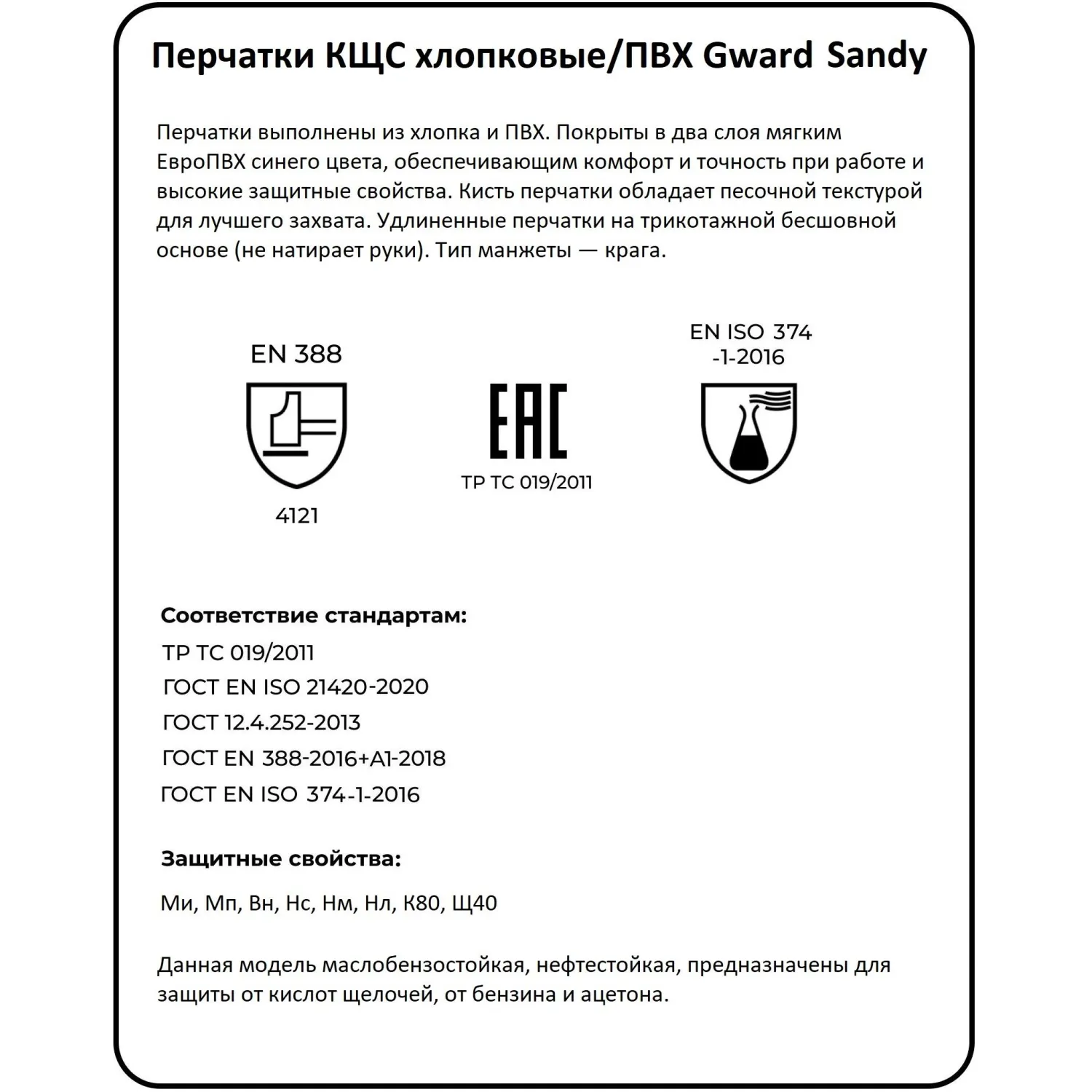 Перчатки выполнены из хлопка и ПВХ. Покрыты в два слоя мягким ЕвроПВХ синего цвета, обеспечивающим комфорт и точность при работе и высокие защитные свойства. Кисть перчатки обладает песочной текстурой для лучшего захвата. Удлиненные перчатки на трикотажной бесшовной основе (не натирает руки). Тип манжеты — крага. Размер — 10, XL.