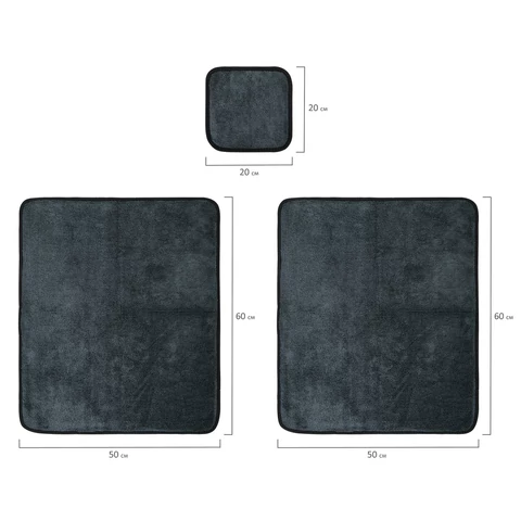 В наборе 2 размера – 50х60 см (2 шт.) и 20х20 см (1 шт.). Салфетки-полотенца изготовлены из микрофибры повышенной плотности – 700 г/м2, способны впитывать влагу до 700% собственного веса.