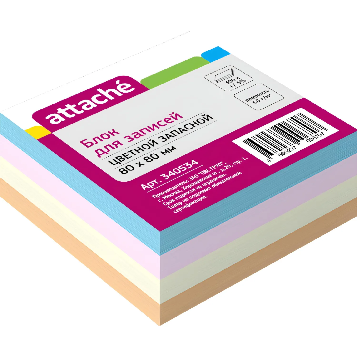 Блок сложен из квадратных листов размером 8×8 см. Листы не склеены между собой. Листы изготовлены из высококачественной офсетной бумаги плотностью 80 г/м2. В блоке представлены листы четырех цветов: желтого,оранжевого, розового, голубого. Всего в блоке 300 листов, из-за особенностей производства возможно отклонение +/- 5%. Блок для записей подходит для письма любыми типами ручек и карандашей. Благодаря высокой плотности листы не продавливаются при нажатии. Поставляется в термоусадочной пленке, защищающей блок при транспортировке.
