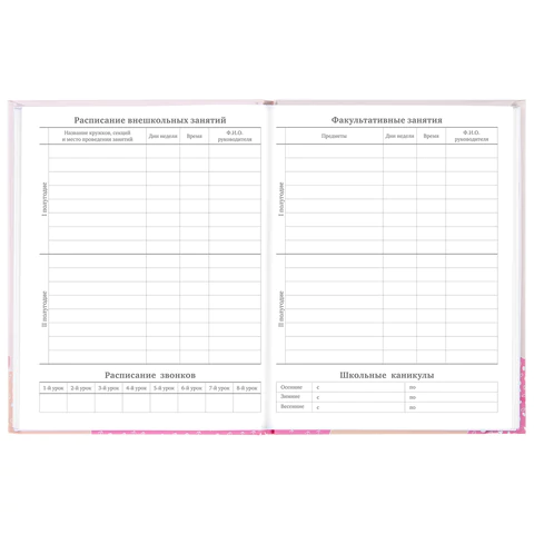 Предназначен для учащихся 5-11 классов. Твердая обложка надежно защищает бумагу и долго сохраняет привлекательный внешний вид. Благодаря глянцевой ламинации краски на изображении становятся более яркими и насыщенными, исключается возможное истирание рисунка. Внутренний блок содержит 48 листов офсетной белой бумаги плотностью 60 г/м2. Дневник снабжен полезным справочным материалом для учащихся.