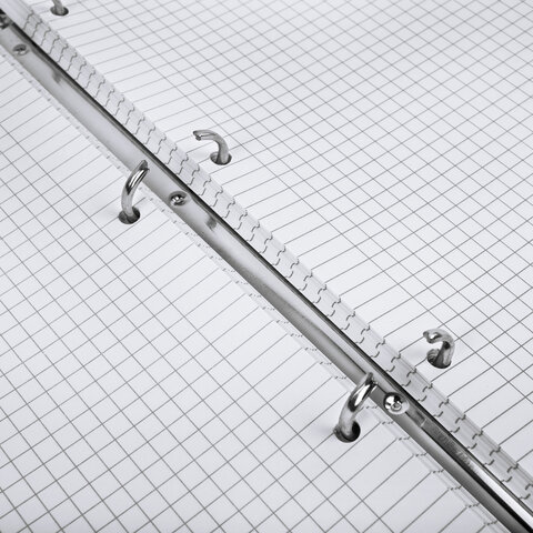 Блок состоит из 120 листов офсетной бумаги белого цвета плотностью 70 г/м2. Линовка – клетка с полями. Гибкая обложка из экокожи с вырубкой под кольца выполнена из износоустойчивого материала с текстурой под гладкую кожу. Увеличенный формат А4 предназначен для ведения большого объема записей. Кольцевой механизм позволяет легко сменить внутренний блок на новый, не покупая при этом новую тетрадь. Одна такая тетрадь способна заменить несколько небольших тетрадей для разного рода информации.