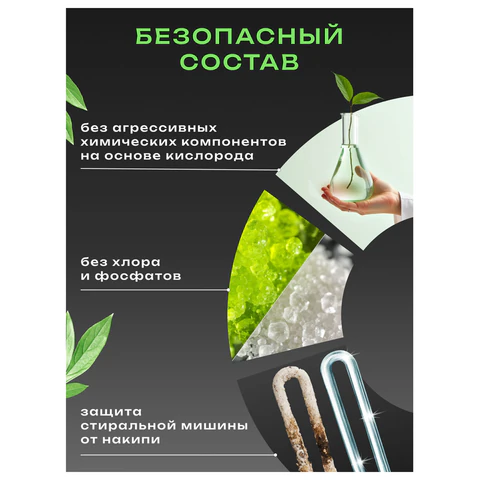 Состав: 5% или более, но менее 15%: анионные ПАВ; менее 5%: мыло (соли жирных кислот), неионогенные ПАВ, отбеливающие вещества на основе кислорода, энзимы, поликарбоксилаты, фосфонаты, оптический отбеливатель, ароматизирующая добавка.