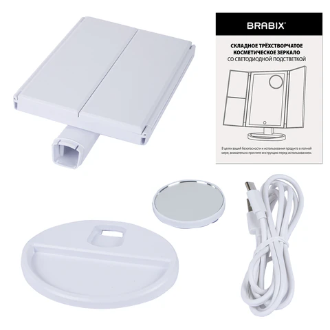 Складное зеркало в пластиковой оправе состоит из трёх частей – центральной и двух боковых, складывающихся по принципу книжки или трюмо. Центральное зеркало оснащено LED-подсветкой, боковые – обладают эффектом 2-х, 3-х и 10-кратного увеличения.