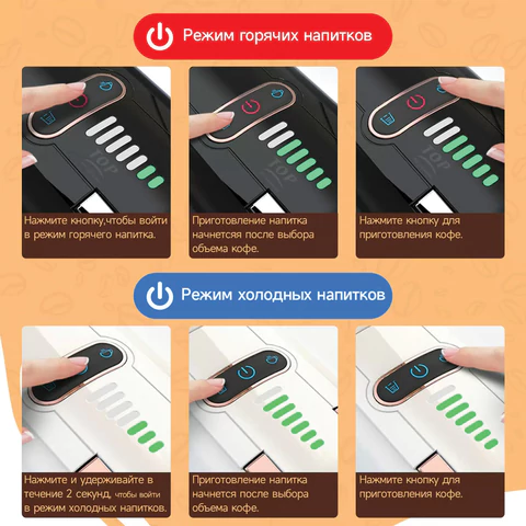 В кофемашине есть два варианта заваривания – холодный и горячий режим, на корпусе расположен светодиодный индикатор заваривания. Холодный кофе для жаркого лета и согревающий – для зимы