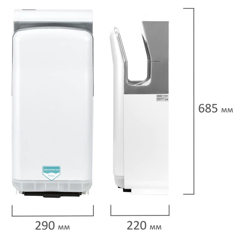 Мощность 2000 Вт обеспечивает время сушки рук за 10 секунд. Мощный поток воздуха подается на руки из тонких форсунок с двух сторон, в результате чего создается эффект срезания капель воды, и руки становятся сухими за несколько секунд, что обеспечивает максимальный уровень комфорта для пользователя. Ультрафиолетовая обработка уничтожает бактерии при сушке. Данную модель отличает наивысший для подобного типа устройств класс влагозащиты – IP24, что означает, что устройство защищено от брызг с любых сторон. Это полностью исключает вероятность короткого замыкания из-за попадания воды на корпус. Устройство оснащено каплесборником для получаемой после сушки рук воды и воздушным фильтром для очистки подаваемого воздуха. Корпус электросушителя изготовлен из ударопрочного пластика. Современный дизайн SONNEN HD-M6667 подчеркнет респектабельность и станет украшением любого интерьера. Подойдет для установки в местах с высокой проходимостью. В комплект поставки входит набор для крепления к стене. Подключается к сети 220V стандартной евровилкой.