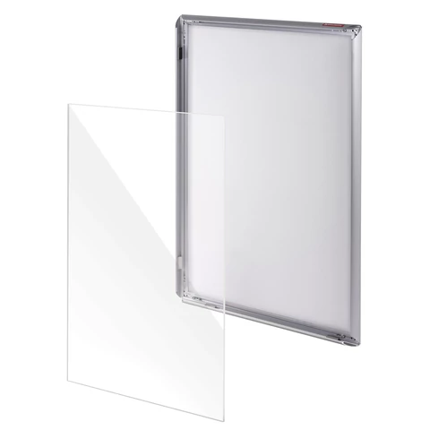Профиль рамки изготовлен из анодированного алюминия. Изменяемое расположение – книжное или альбомное. Благодаря прозрачному антибликовому покрытию документы отчётливо видны посетителю, не мнутся и не загрязняются в течение всего эксплуатационного периода. Рамка крепится к стене через специальные отверстия при помощи дюбелей и саморезов. Элементы крепления входят в комплект. Максимальная высота вставляемого листа – 594 мм, максимальная ширина вставляемого листа – 420 мм. Цвет рамки - матовое серебро. Ширина багета – 2,5 см.