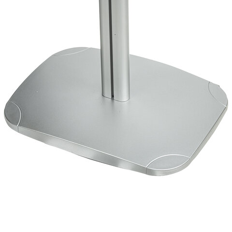 Профиль рамки и стойка изготовлены из анодированного алюминия. Возможность горизонтального и вертикального крепления рамки. Благодаря прозрачному антибликовому покрытию документы отчётливо видны посетителю, не мнутся и не загрязняются в течение всего эксплуатационного периода. Утяжеленное основание обеспечивает надежную устойчивость. Максимальная высота вставляемого листа - 420 мм, максимальная ширина вставляемого листа - 297 мм. Общая высота - 1 260 мм. Цвет рамки - матовое серебро.