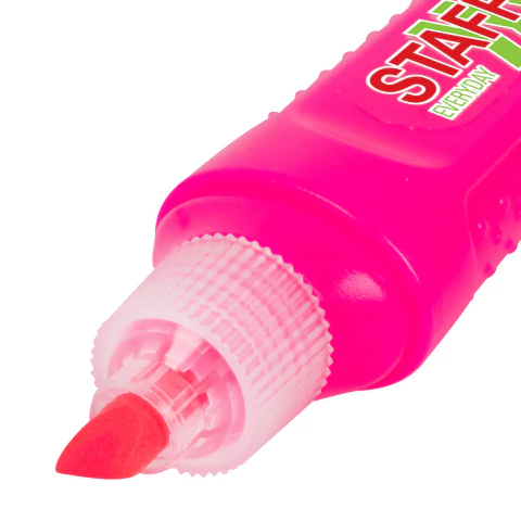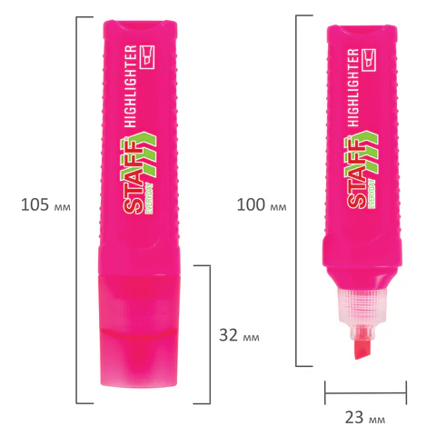 Текстовыделитель розового цвета обладает прямоугольной формой корпуса диаметром 24 мм. Корпус оснащен удобной зоной захвата. Скошенный наконечник имеет толщину линии письма от 1 до 5 мм, что обеспечивает удобство при работе с текстом, напечатанным мелким шрифтом, или таблицами.