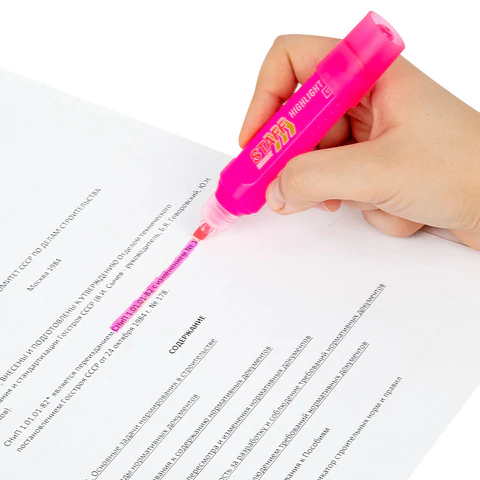 Чернила с неоновым эффектом обеспечивают неповторимую яркость выделения текста. Светоустойчивые чернила на водной основе не выцветают даже на открытом солнце, быстро впитываются и не размазываются в процессе использования. Текстовыделитель обладает экономным расходом чернил. Изделие не перезаправляется.
