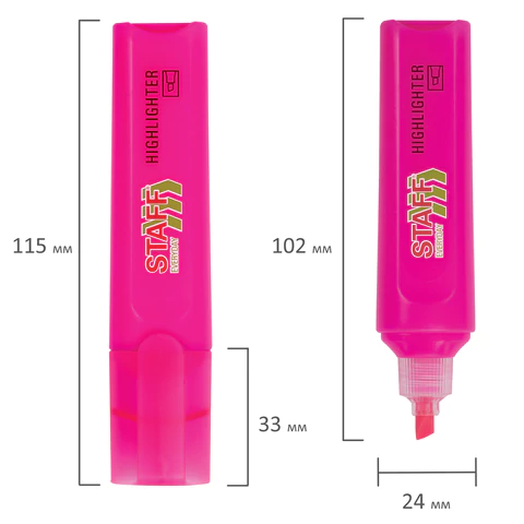 Текстовыделитель розового цвета обладает прямоугольной формой корпуса диаметром 26 мм. Корпус оснащен удобной зоной захвата. Скошенный наконечник имеет толщину линии письма от 1 до 5 мм, что обеспечивает удобство при работе с текстом, напечатанным мелким шрифтом, или таблицами.