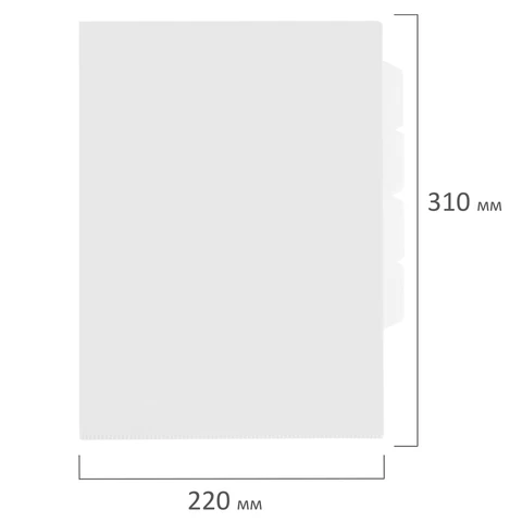 Папка формата А4 выполнена из высококачественного полипропилена плотностью 150 мкм. Она предотвращает смятие, загрязнение или намокание бумаг. Имеет 3 отделения, разделенных ярлычками. Прозрачный материал позволяет увидеть содержимое, не открывая папку.