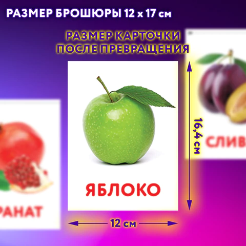 Для более удобной игры с малышом книжки-брошюры можно разрезать по пунктирной линии вверху и превратить их в развивающие карточки. Это позволит малышу разглядывать картинки по одной. После превращения брошюр в карточки размер каждой карточки становится 12х16,4 см.