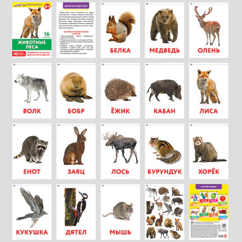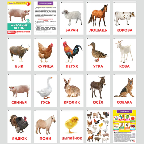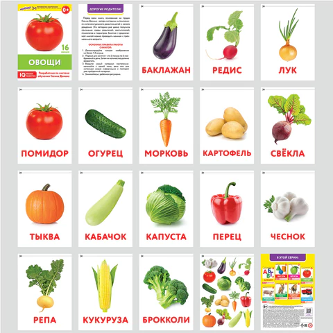 Набор содержит 8 книжек-брошюр по различным 8 тематикам: алфавит, животные фермы, животные леса, животные Африки, овощи, фрукты, фигуры, транспорт. Каждая брошюра снабжена красочными и реалистичными изображениями, общим количеством – 145 изображений в наборе. Размер каждой брошюры - 12х17 см. Именно реалистичные, а не анимационные изображения предметов формируют правильную понятийную сферу у ребенка.