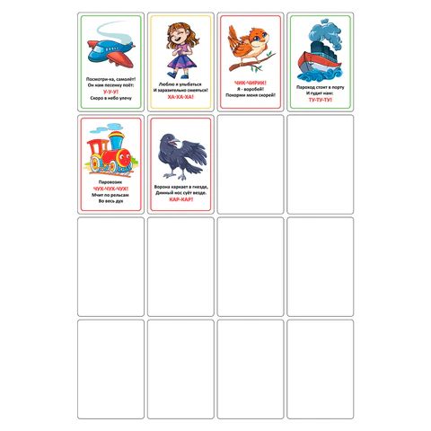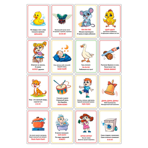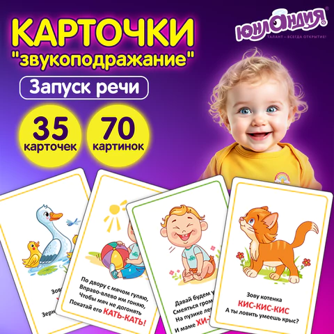 Набор развивающих карточек "Звукоподражание" ЮНЛАНДИЯ подойдет для детей самого раннего возраста. Звукоподражание – это первые слоги малыша, работа над произнесением которых развивает артикуляционный аппарат и понятийную сферу.