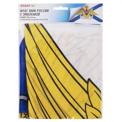 Флаг Военно-Морского Флота России "Андреевский флаг" представляет собой прямоугольное двухстороннее полотно белого цвета, пересечённое синим диагональным (Андреевским) крестом, содержит эмблему ВМФ. Яркое изображение с двух сторон флага.