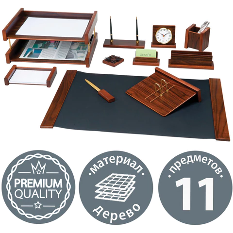 Набор состоит из 11 предметов: двойной лоток для бумаг, коврик для письма (размер - 66х43 см), подставка для ручек (2 шариковые ручки в комплекте), стакан-подставка для письменных принадлежностей, подставка для бумажного блока, подставка для визиток, нож для вскрытия конвертов, подставка для писем, скрепочница магнитная, подставка для перекидного календаря, часы. Все предметы изготовлены из дерева цвета "орех" с золотистой фурнитурой. Набор упакован в фирменную подарочную коробку.