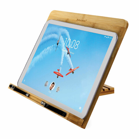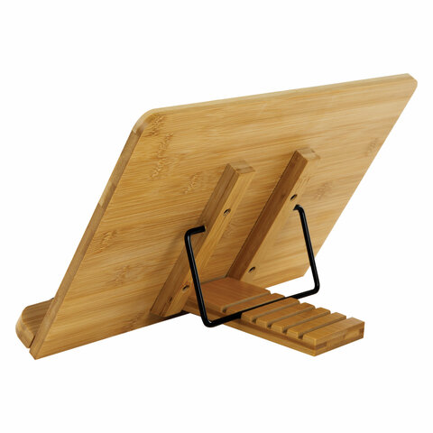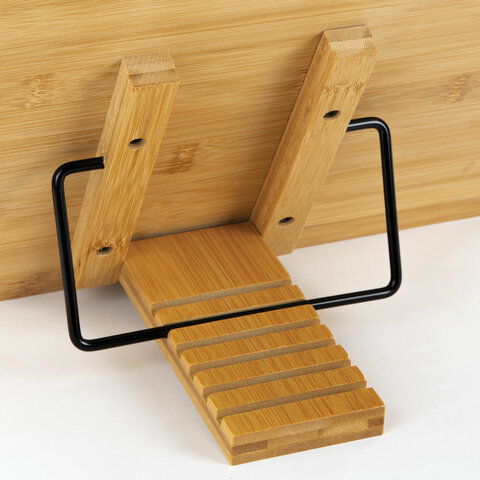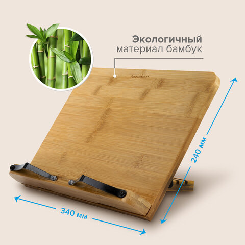 Подставка BRAUBERG выполнена из экологичного материала - бамбука. Она способна удержать даже увесистые книги или гаджеты. Регулируемый наклон подставки позволяет комфортно разместить книгу, журнал или планшет на рабочем месте, обеспечивая удобство при чтении и работе с текстом, а также при просмотре видео. Держатели страниц, фиксирующие книгу снизу на выбранной странице, также оснащены насадками, которые защищают поверхность от царапин. Имеет увеличенный размер - 34х24 см.