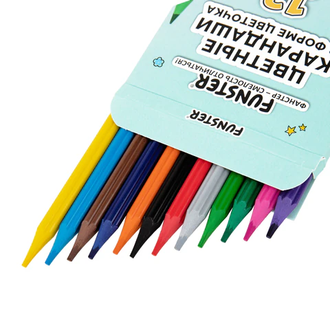 Набор состоит из 12 цветов: черного, синего, голубого, салатового, зеленого, желтого, оранжевого, розового, красного, серого, фиолетового, коричневого. Форма корпуса в виде цветочка имеет привлекательный вид, обеспечивает эргономичность и удобство использования. Карандаши изготовлены из качественного цветного пластика. Качество исполнения гарантирует легкую заточку. Грифель обладает повышенной прочностью. Все карандаши заточены и поставляются в картонной упаковке с европодвесом.