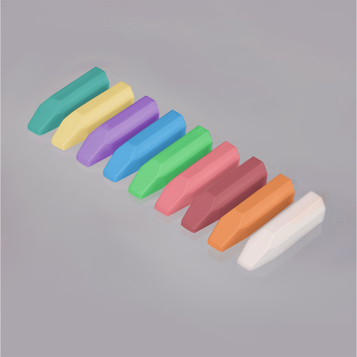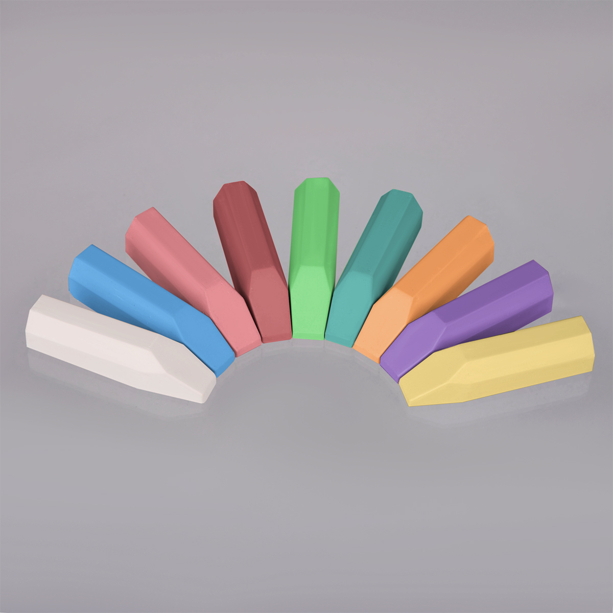 Уникальная форма мелка, которую легко и удобно держать в руке. Натуральный состав на основе мела, гипса, воды и пигментов, без выраженного запаха, средняя твердость.