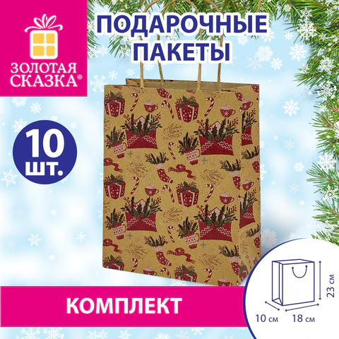 Подарочный пакет новогодний изготовлен из крафт-бумаги, снабжен бумажными ручками. Размер – 18x10x23 см. Пакет украшен изображением новогодних атрибутов.